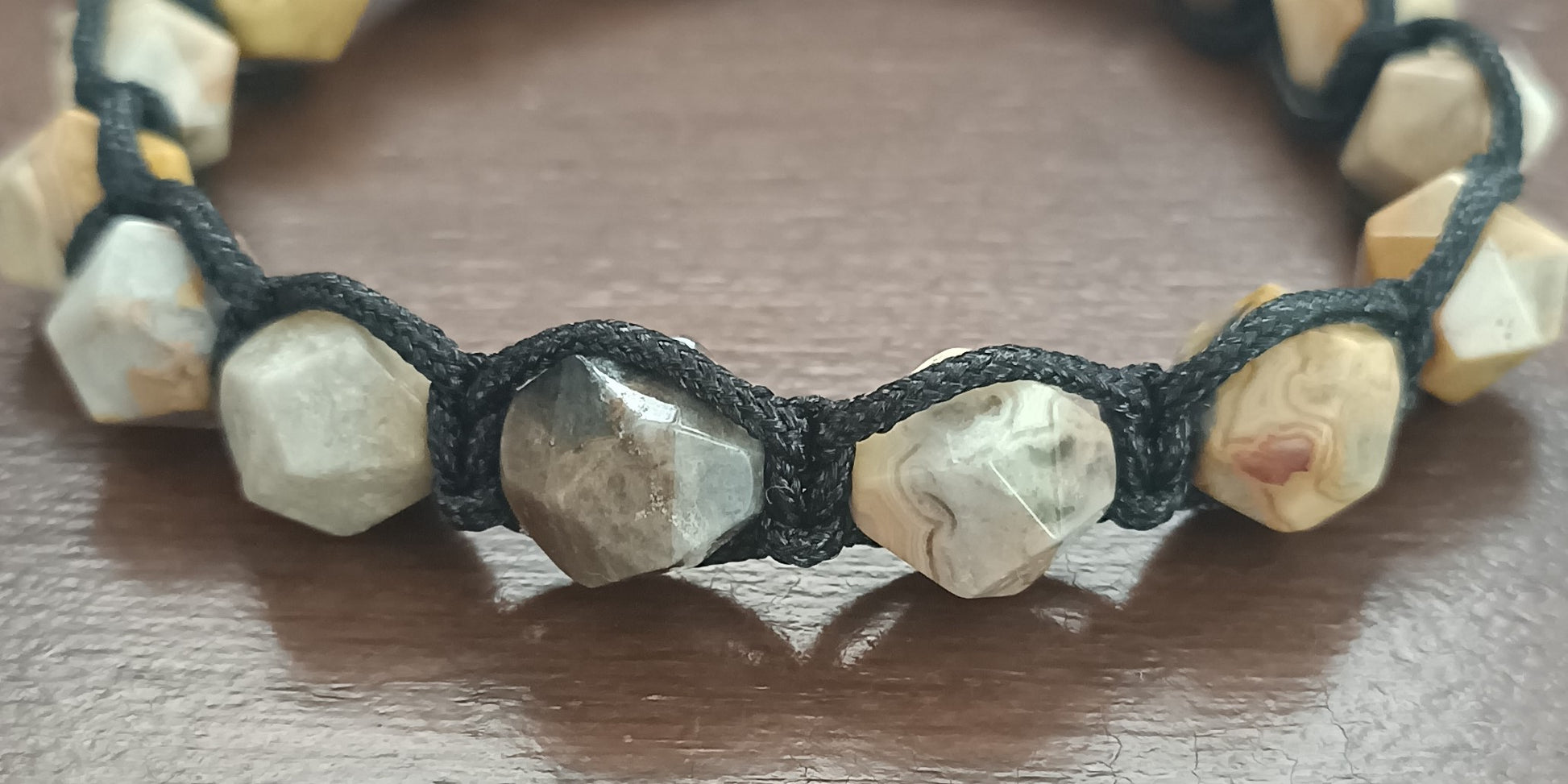 This men's bracelet is made with natural yellow landscape jade beads, faceted in shape, mounted on a nylon cord using the Shamballa technique. Each bead has a diameter of 10 mm.