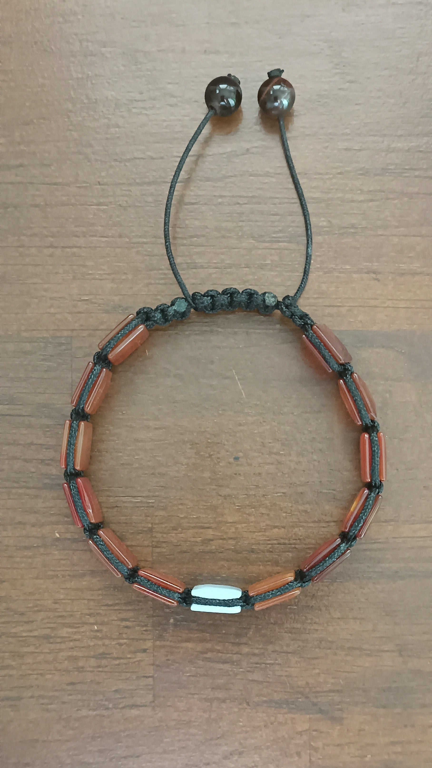 Le bracelet est doté d’une fermeture ajustable et se termine par deux perles d'agate aux extrémités du cordon.