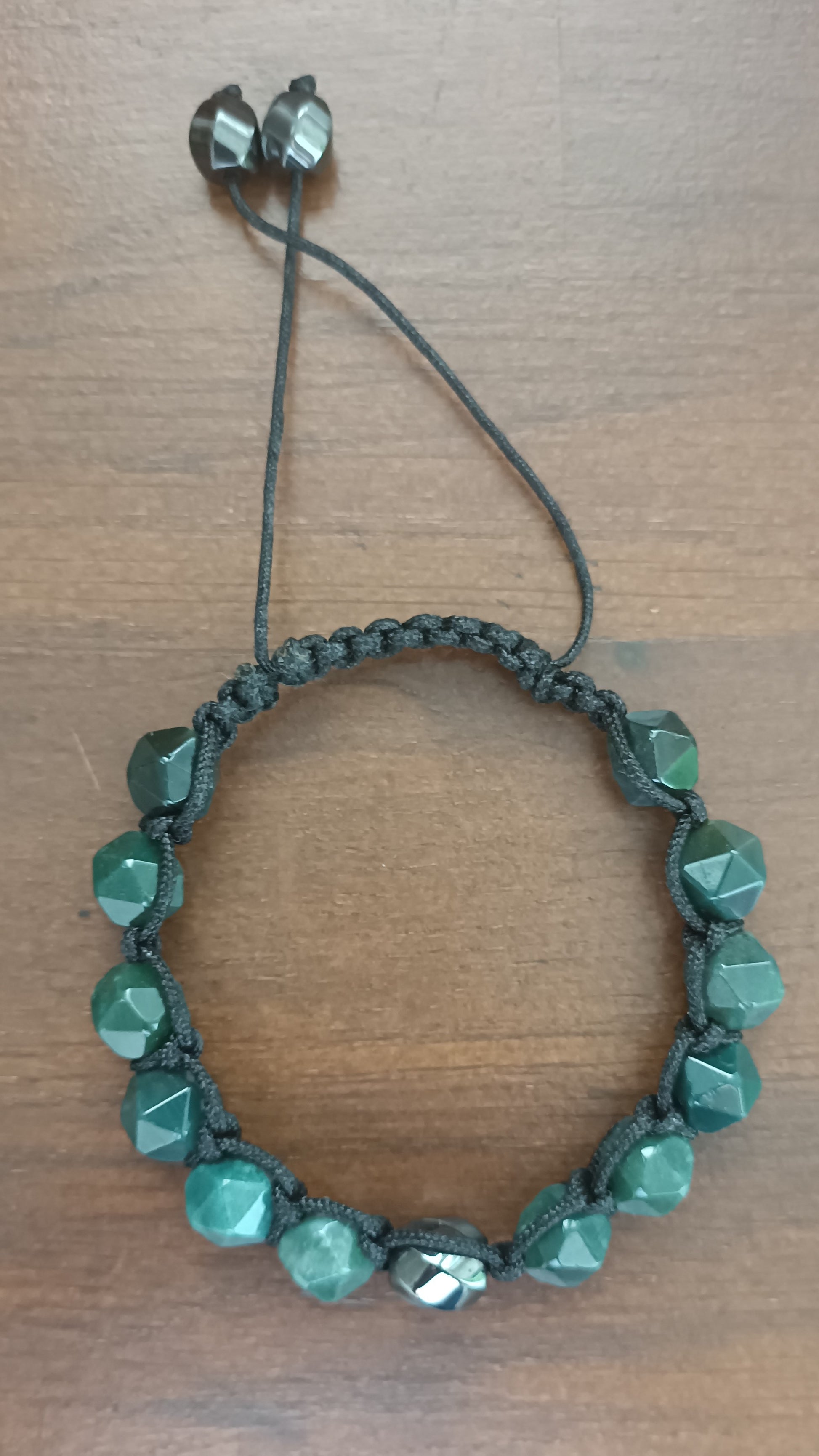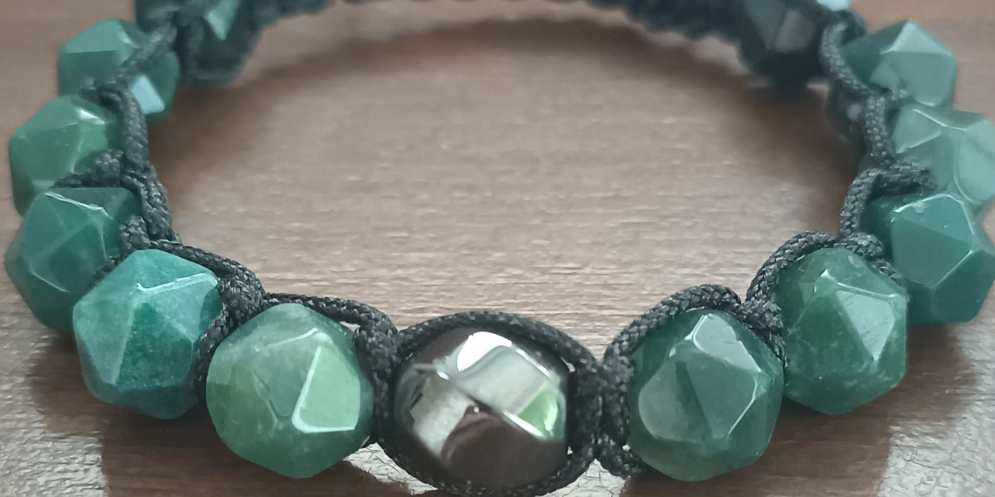 Ce bracelet pour homme est réalisé avec des perles en agate mousse vert naturelle et une perle d'hématite, de forme facettée, montées sur un cordon en nylon selon la technique Shamballa. Chaque perle a un diamètre de 10 mm.
