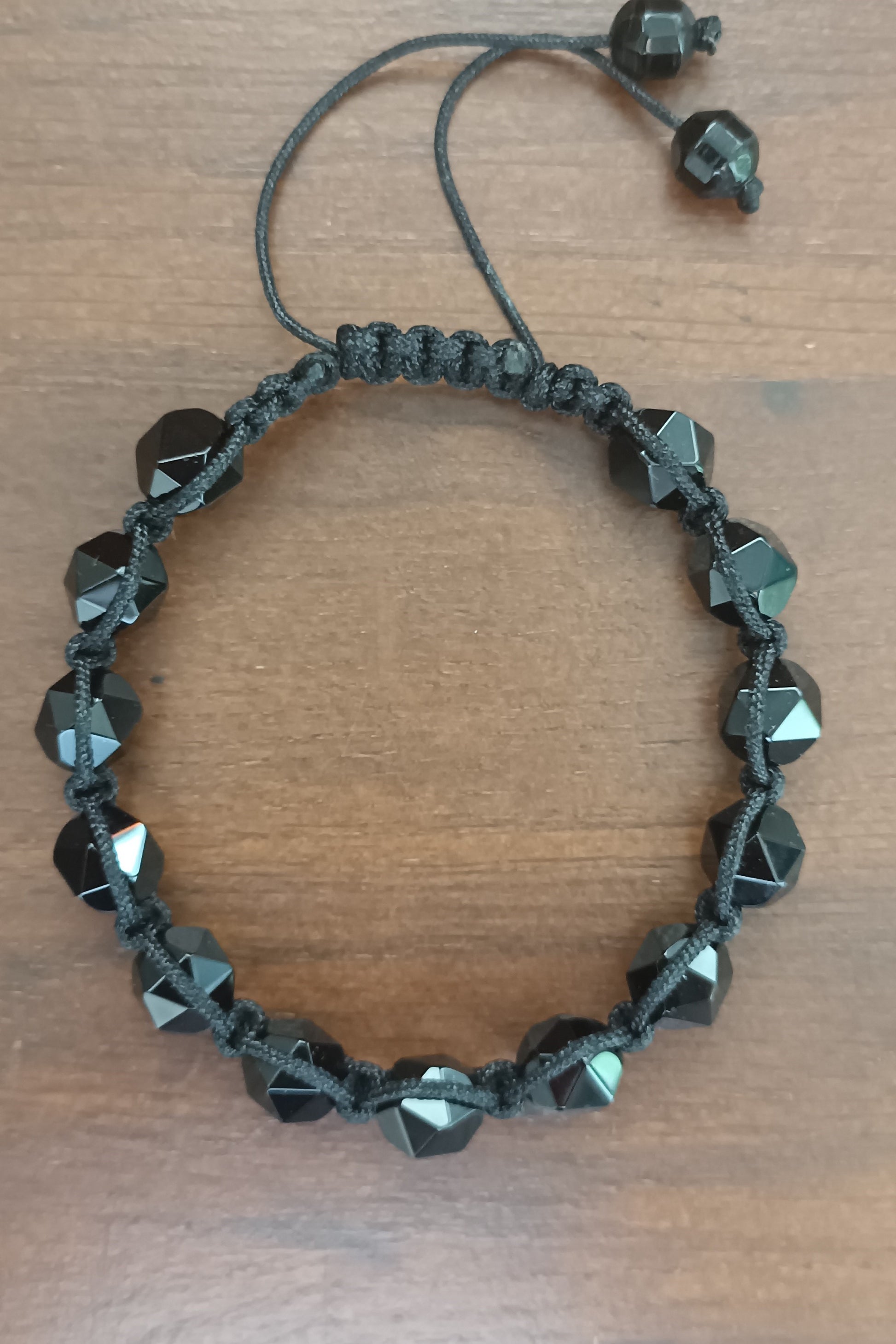 Ce bracelet pour homme est confectionné avec des perles en agate naturelle. Les perles, de forme facettée, sont montées sur un cordon en nylon selon la technique Shamballa.