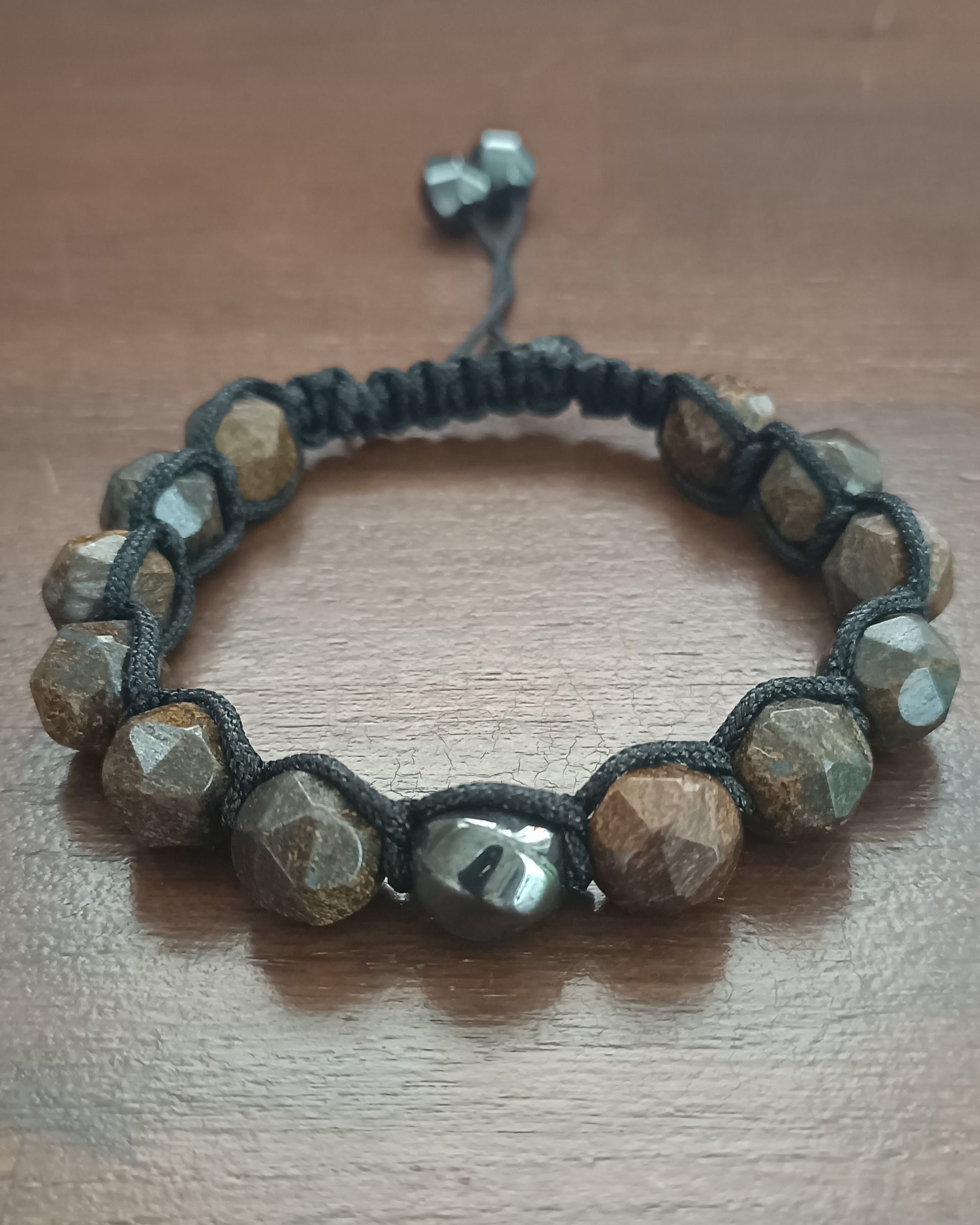 Ce bracelet pour homme est réalisé avec des perles en bronzite naturelle avec une perle d'hématite, de forme facettée, montées sur un cordon en nylon selon la technique Shamballa. Chaque perle a un diamètre de 10 mm.
