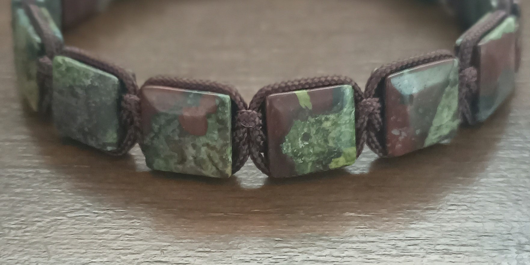 Ce bracelet pour homme est réalisé avec des perles en épidote naturelle, de forme carrée, montées sur un cordon en nylon selon la technique Shamballa. Chaque perle mesure 10x10 mm.
