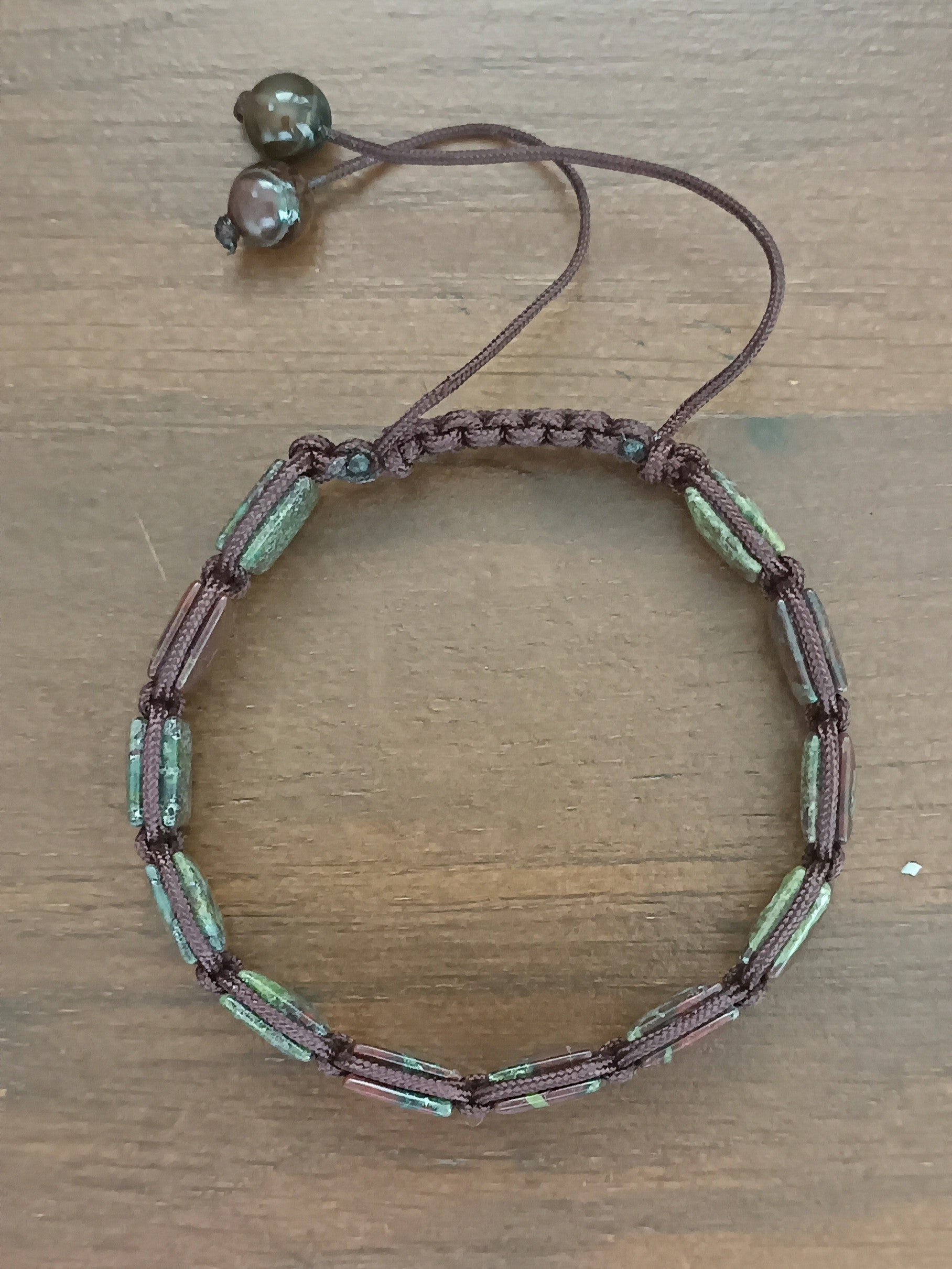 Le bracelet est équipé d'une fermeture ajustable et se termine par deux perles d'agate marron aux extrémités du cordon.