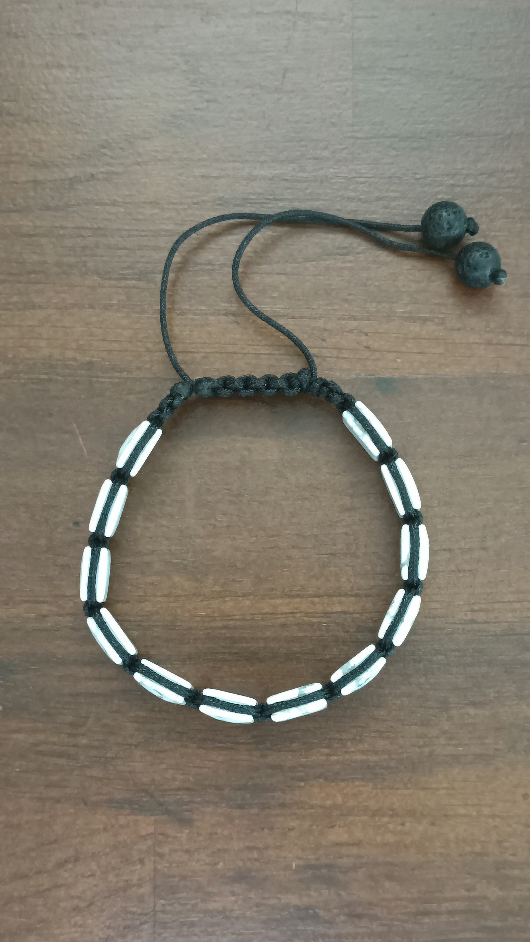 Ce bracelet pour homme est réalisé avec des perles en howlite naturelle, de forme carrée, montées sur un cordon en nylon selon la technique Shamballa. Chaque perle mesure 10x10 mm.