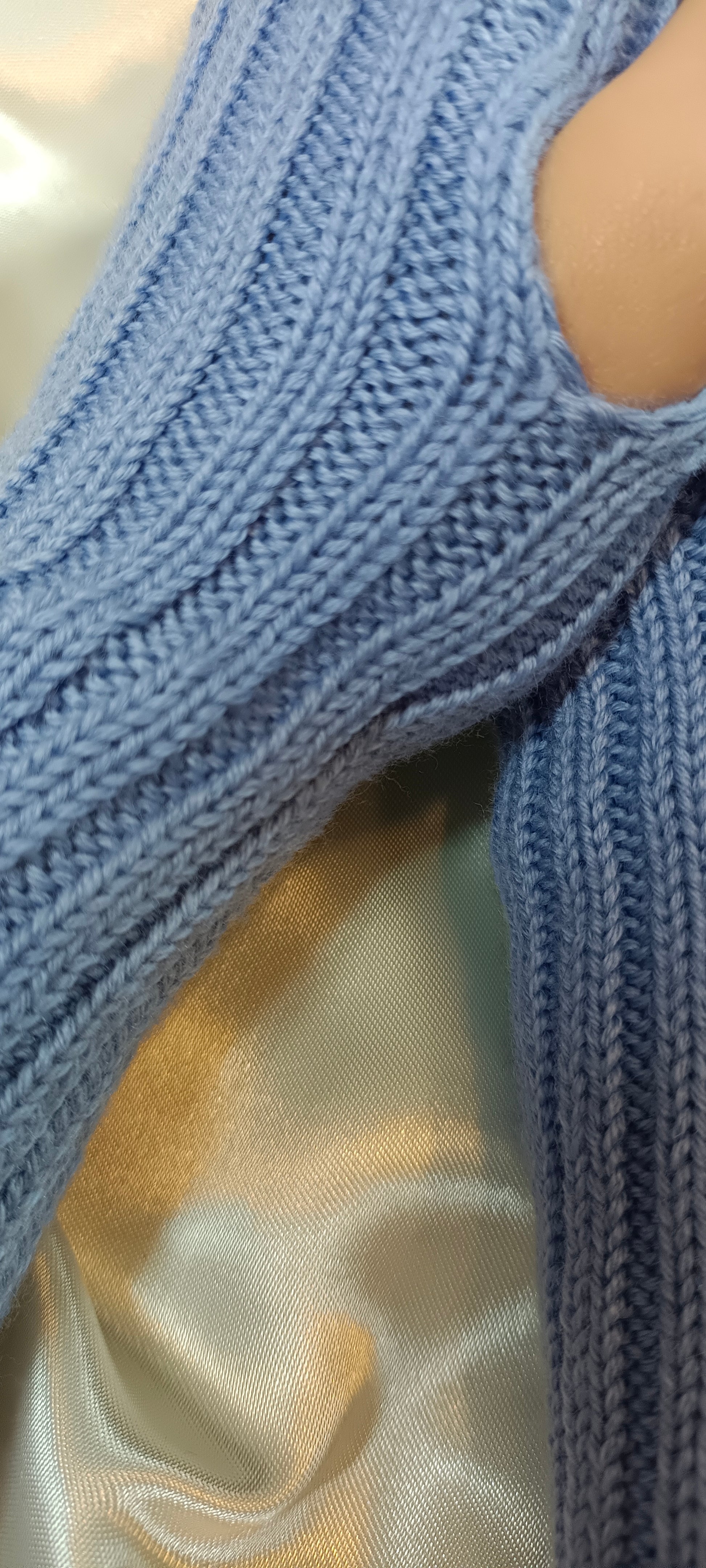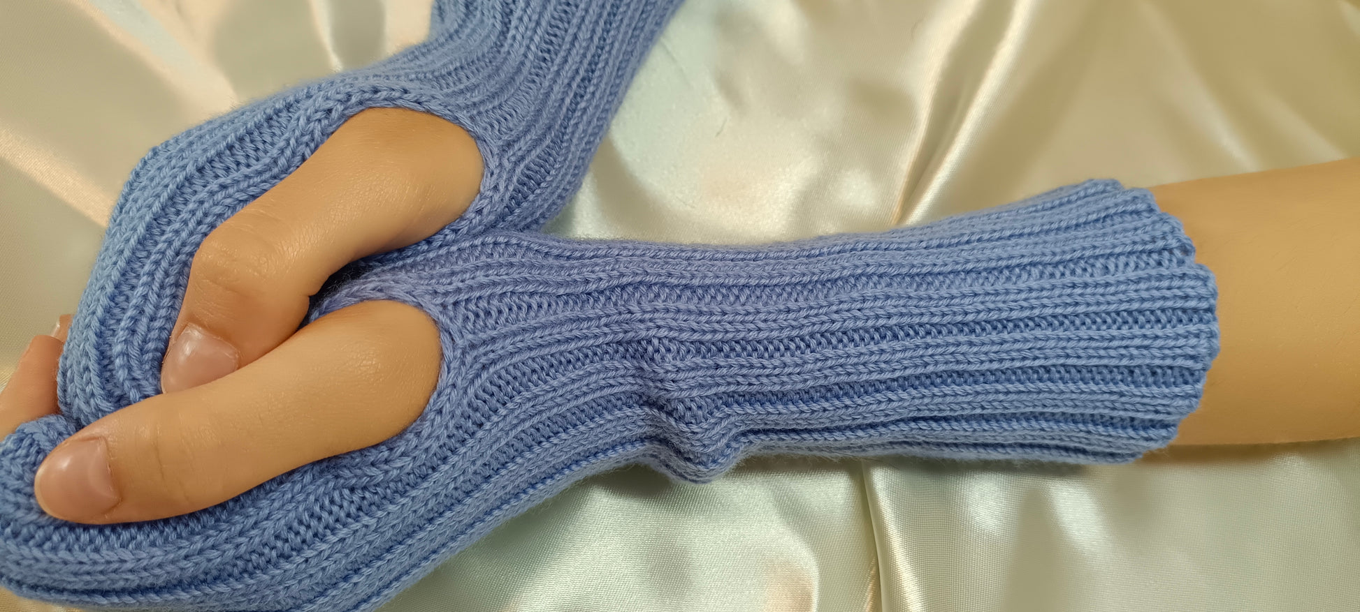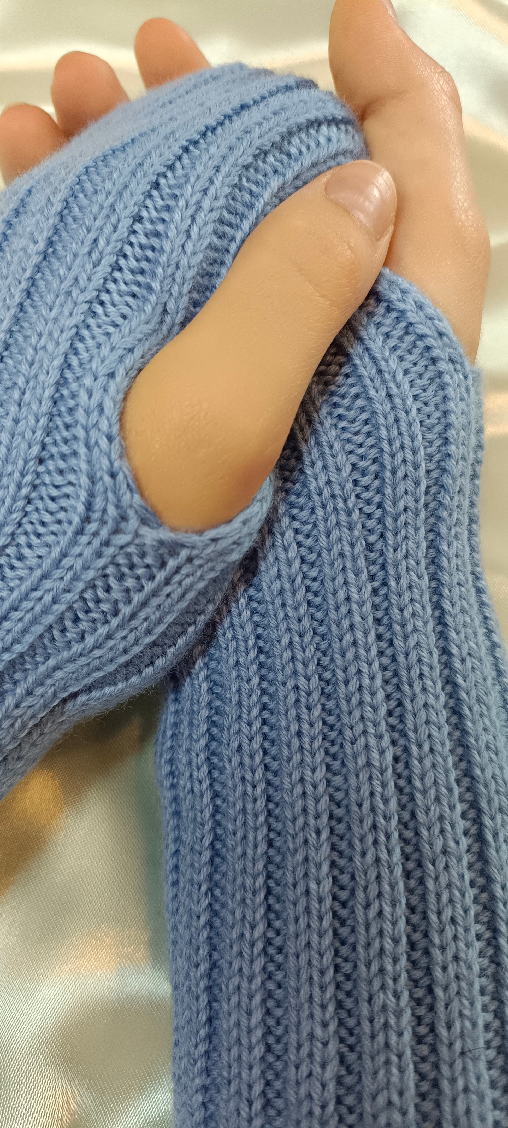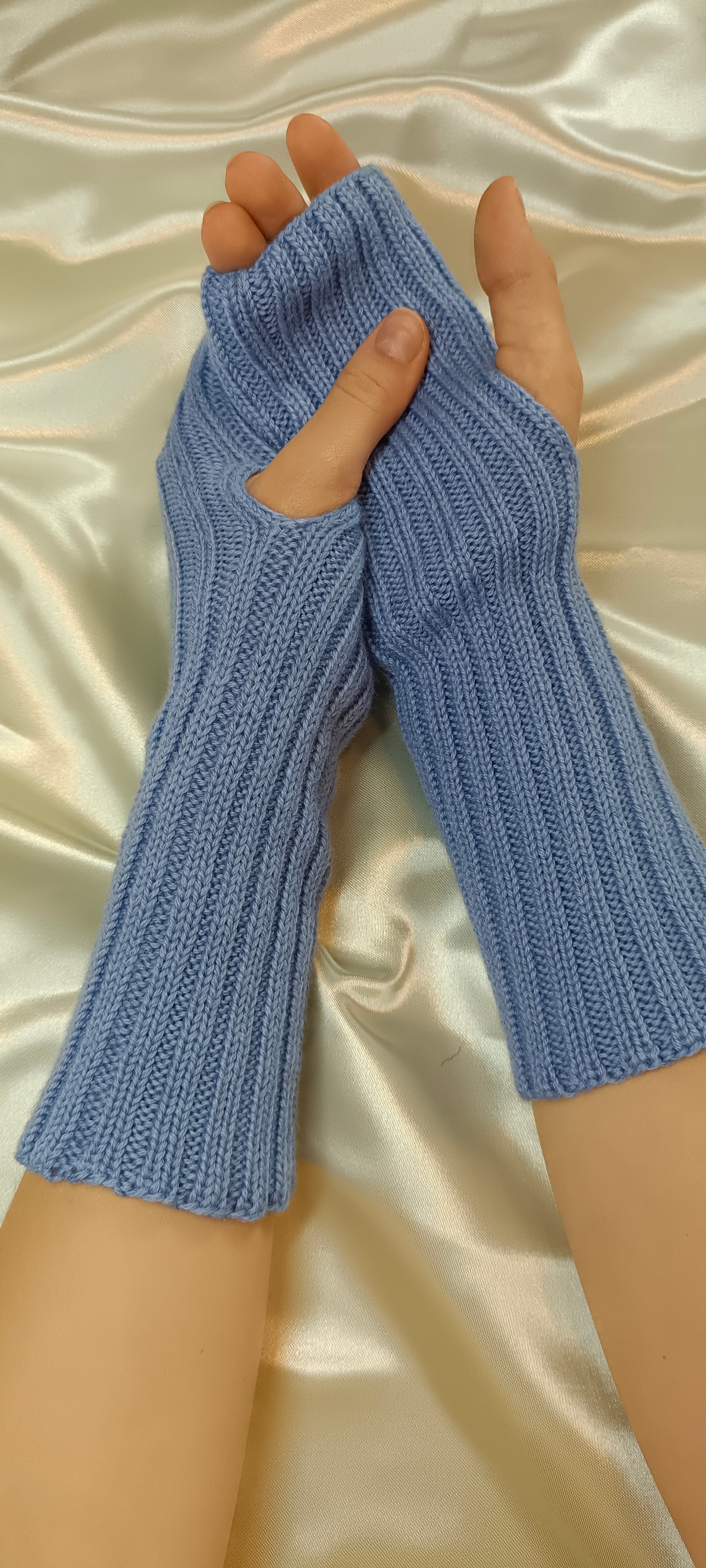 Modèle unique tricoté en pure laine mérinos italienne extra-fine, spécialement conçu pour la confection de mitaines. Réalisé sans coutures, il garantit un confort exceptionnel. Couleur bleu clair.